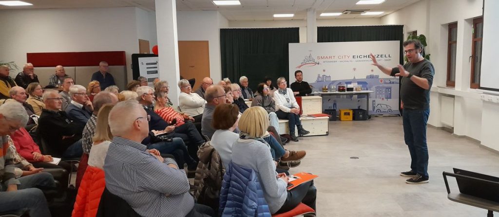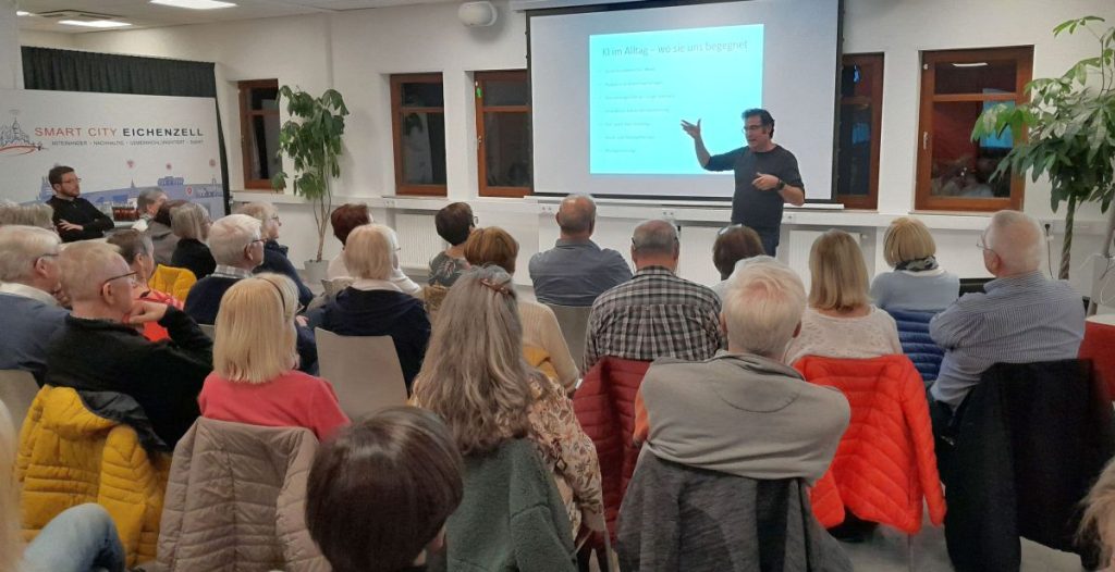 Es war eine Sternstunde in der Reihe der Digitalcafé-Vorträge des Jahres 2025: Immer wieder brandete im Veranstaltungsraum des Eichenzeller Smart City Forums am 6. November Gelächter und Applaus auf, einige der Gäste hielt es nicht auf den Stühlen. Fast 60 Besucherinnen und Besucher erfuhren im Rahmen der Veranstaltung von Smart City Eichenzell, antonius sowie Leben und Arbeiten in Eichenzell e.V., was Künstliche Intelligenz heute schon alles kann, – und staunten.