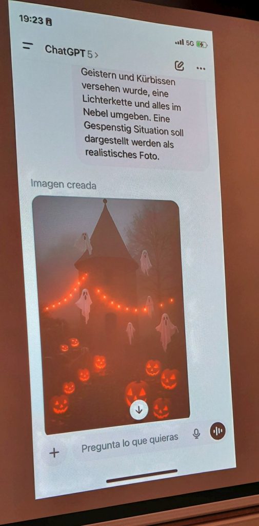 „Herr Werthmüller, ich bin fassungslos“, sagte ein Besucher kopfschüttelnd. Basierend auf nur wenigen Daten – seinem Namen, seinem Wohnort, einem Hobby und anderen Kleinigkeiten – hatte die KI-App „ChatGPT“* innerhalb von wenigen Minuten ein komplettes Lied mit mehreren Strophen auf den Mann gedichtet – und als Hardrock-Song vertont. „Seien Sie ehrlich mit mir“, fuhr der Herr fort. „Hat das wirklich die KI gerade gemacht oder hatten Sie das vorbereitet?“ Michael Werthmüller, Referent von der VHS Landkreis Fulda, musste die KI erst noch eine Beschwerde an eine Autowerkstatt schreiben und sie auf Zuruf aus dem Publikum ein Bild eines rosa Pudels basteln lassen, bevor die Teilnehmerinnen und Teilnehmer ihm glaubten. Nur das gewünschte Eichenzeller Türmchen im Halloween-Look bekam die KI nicht hin – der gewählte Turm sah dem Original so gar nicht ähnlich. Und auch der festlich gedeckte Gewölbekeller des Eichenzeller Herrenhauses hatte dann doch zu viele Gewölbebögen.