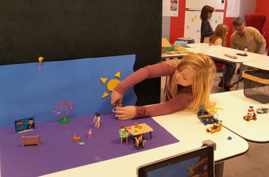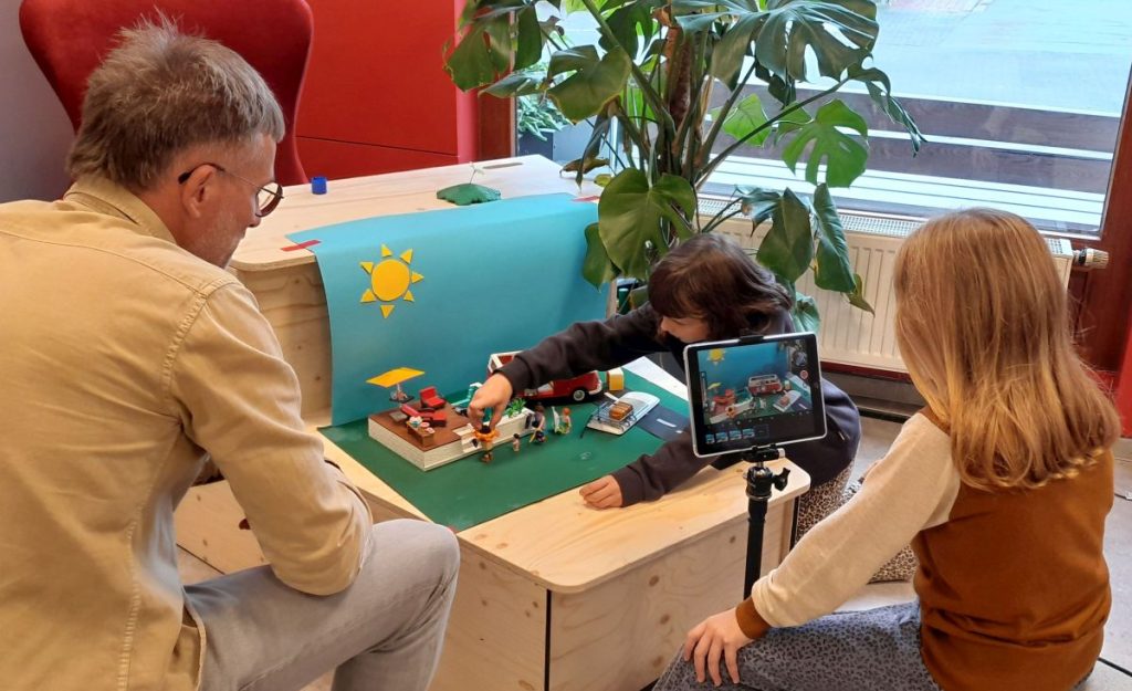 „Weißt Du, wann der Bus kommt?“, tönt durch den Veranstaltungssaal. Ein neunjähriger Junge beugt sich gemeinsam mit seiner Mutter eifrig über das Tablet und lässt wieder und wieder einen kleinen Trickfilm abspielen, den er selbst hergestellt und vertont hat. Nebenan verändert die sechsjährige Malin sorgfältig die Haltung von Legofiguren – hier ein Arm etwas nach oben, dort ein Bein nach vorne, auf dem Tisch wirft eine Spielzeugkatze eine Tasse um. Klick, ein Bild, und erneut bewegt sie die Figuren. Wieder ein paar Meter weiter knien Vater Alexander und Tochter Lotte vor einem iPad auf einem Stativ und geben der achtjährigen Anni Anweisungen, wie sie ein Spielzeugwohnmobil Zentimeter für Zentimeter zu einem Playmobil-Ferienhaus dirigieren soll. Es herrscht eine konzentrierte Arbeitsatmosphäre, gelegentlich unterbrochen von einem Ausruf „Oh nein, jetzt war Deine Hand im Bild!“ und viel Gelächter.