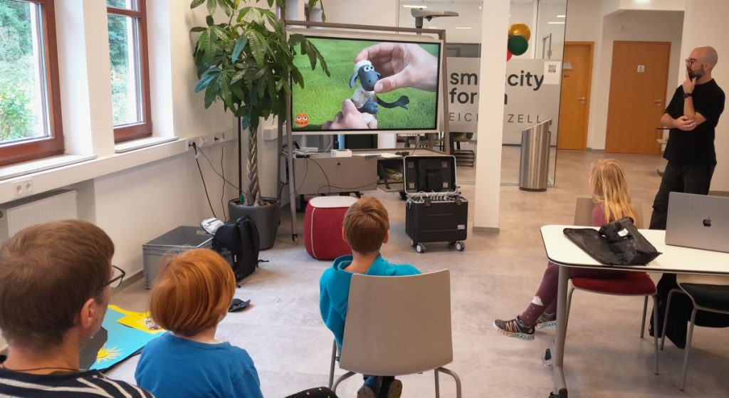 Im Rahmen der neuen Workshopreihe „digitales Labor für Familien“ von Smart City Eichenzell und „Menschen und Medien e.V.“ verwandelte sich das Smart City Forum am Samstag, den 25. Oktober 2025, in ein Filmstudio. Medienpädagoge Hannes Spicker leitete den Workshop und zeigte anhand eines kurzen „Sendung mit der Maus“-Beitrags, wie die beliebte Knetfigurenserie „Shaun das Schaf“ im Stopptrickfilmverfahren hergestellt wird. Anschließend war es Zeit für eigene Geschichten: Mit buntem Karton, Autos, Lego- und Playmobilfiguren sowie mitgebrachtem Lieblingsspielzeug bauten vier Erwachsene und fünf Kinder Filmkulissen und fügten mit Hilfe der App „Stop Motion Studio“ Bild für Bild ihre Filme zusammen. Am Ende des dreistündigen Workshops hatten alle Teilnehmenden ihre Filme fertig und durften sie mit nach Hause nehmen.