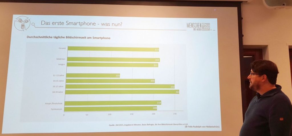 Auch die Medienzeiten sollte man gemeinsam mit dem Kind besprechen. Anhand einer Tabelle zur täglichen Online-Nutzung von 2014-2024 zeigte der Medienpädagoge, dass sich die durchschnittlichen Nutzungszeiten am Smartphone allen Befürchtungen zum Trotz in diesem Zeitraum kaum verändert hätten. „Zwölf- und Dreizehnjährige haben aktuell eine Bildschirmzeit von durchschnittlich zwei Stunden“, erläuterte der Medienpädagoge. Er halte dies für zu viel – allerdings beinhalte Bildschirmzeit auch wirklich alles, was man am Smartphone tue. Als Eltern müsse man sich überlegen, ob beispielsweise das Erledigen einer Online-Recherche für die Schule oder das Hören von Musik oder Hörspielen, während das Kind parallel im Zimmer mit etwas Anderem beschäftigt sei, den gleichen Medienzeitbeschränkungen unterliege wie etwa das Anschauen von Videos.